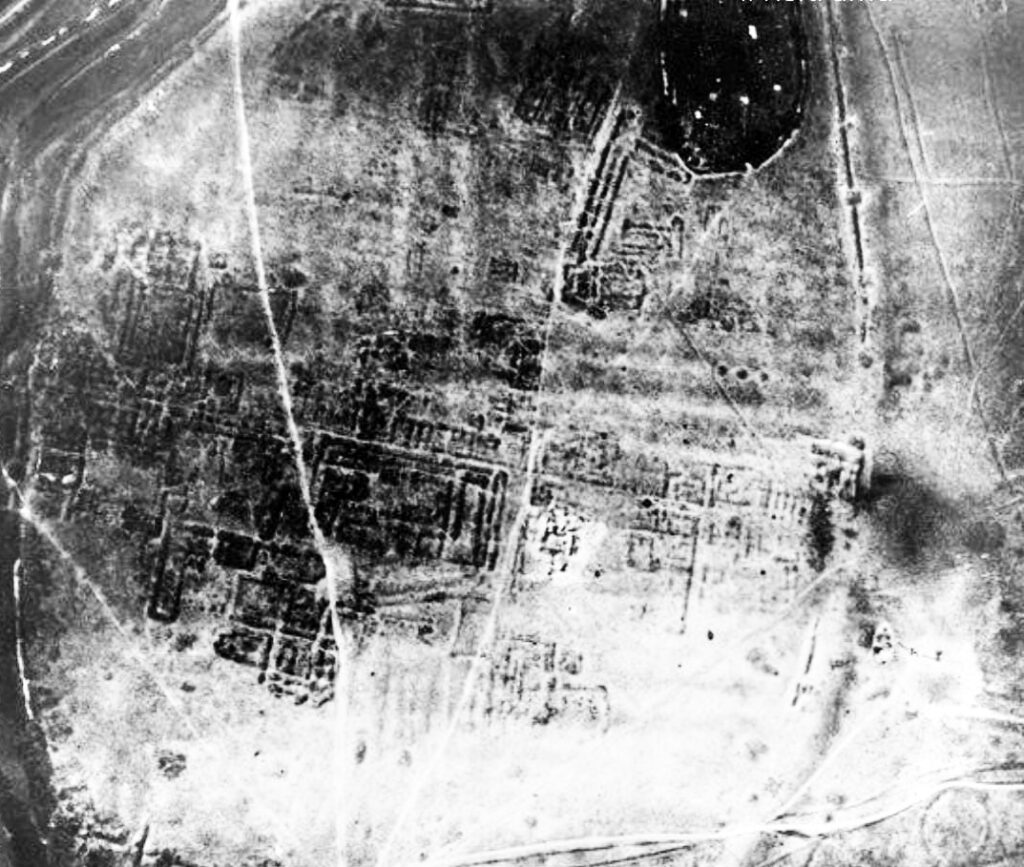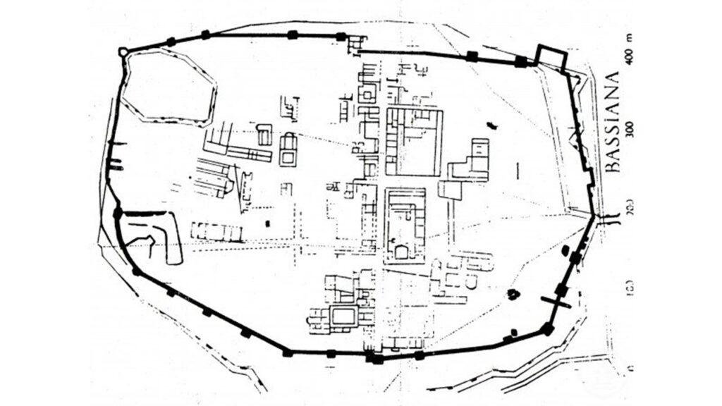 Rekonstrukcija urbanističkog plana Basijane prema avionskom snimku i situacionom planu M. Grbića iz 1935. godine (po O. Brukner, Rimski grad Basijana, sl. 2, Građa za proučavanje spomenika kulture Vojvodine XV, Novi Sad 1988. godine)
